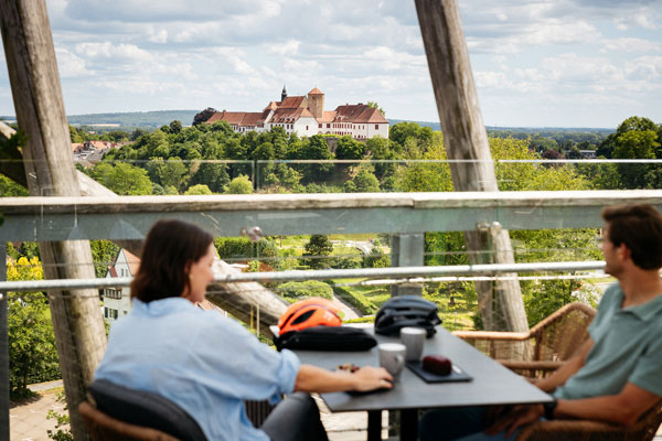 Auszeit genießen auf dem Baumwipfelpfad Bad Iburg mit Blick auf der Schloss Iburg. Tourismusgesellschaft Osnabrücker Land mbH Foto: Christoph Steinweg