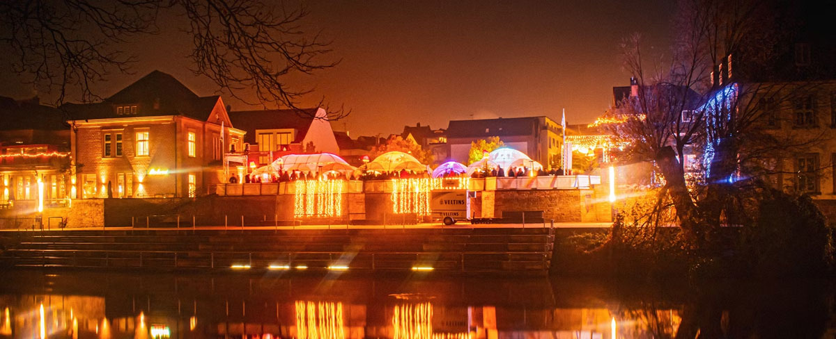 Stilvolle Kuppelzelte mit unterschiedlichen Steh- und Sitzbereichen, funkelnder Lichterglanz überall und ein schwimmender Adventskranz mit vier großen, roten Kerzen auf der Ems machen den Emszauber zum perfekten Ziel für alle, die mal eine Abwechslung zum klassischen Weihnachtsmarkt suchen. Mitten in der Rheiner Winter:City ist der Emszauber der perfekte Ort für einen Ausflug in die schöne Emsstadt.
