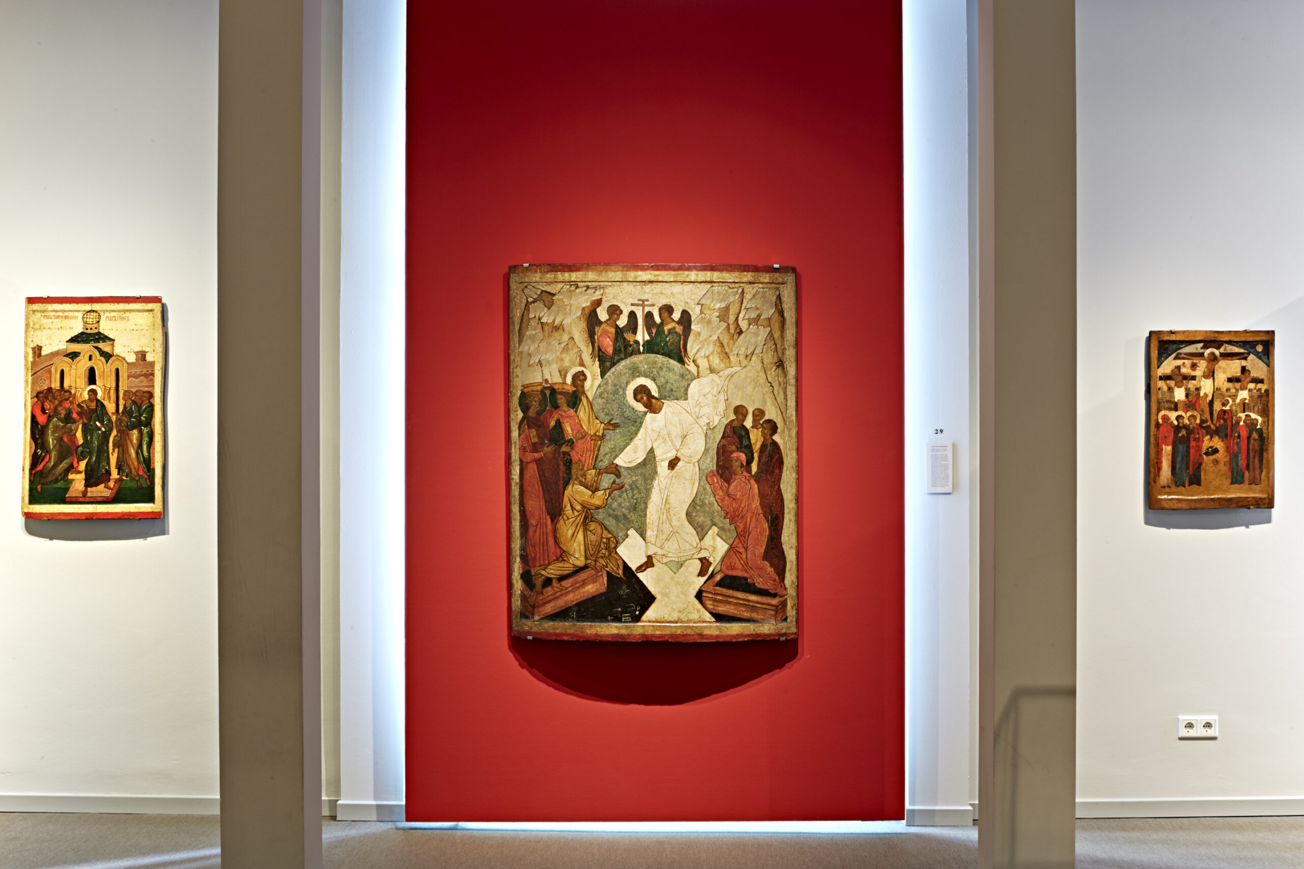 Zur Wiedereröffnung konnten damals drei hervorragende Ikonen erworben werden: eine äußerst fein gemalte Darstellung einer Kirchenikonostase mit zehn Reihen von Einzelikonen aus der Zeit um 1800, ferner eine über 1,80 m hohe Tafel mit der Darstellung des Marienhymnus „Über Dich freuet sich“, die mit ihren barocken Einflüssen dem Geschmack der russischen Aristokratie in der Zeit um 1700 entsprach, und eine ebenso große Tafel des „Jüngsten Gerichts“ aus der zweiten Hälfte des 17. Jahrhunderts.