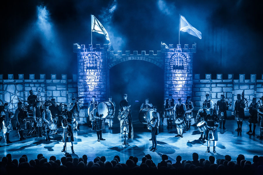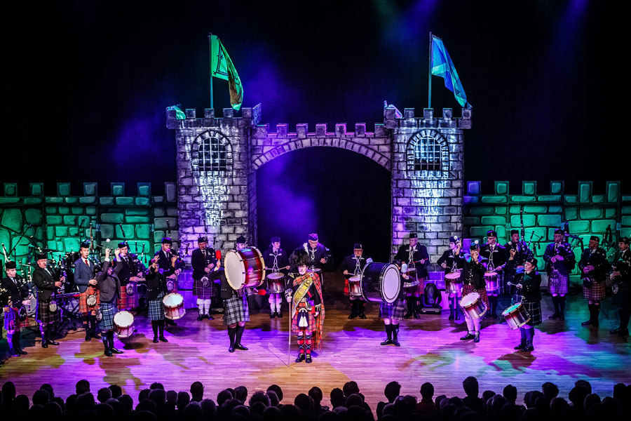 Vor einer Schlosskulisse mit Türmen und Zinnen - die Nachahmung eines schottischen Castles - präsentieren die Künstler immer neue Facetten der schottischen Kultur. Brauste eben noch der eindrucksvolle Klang der Bagpipes und Drums durch die Halle und erfasste die Menschen auf den Tribünen, sorgen im nächsten Moment gefühlvolle Balladen voll Sehnsucht und Weite für berauschende Anmutung im Saal.
